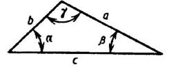 а, b, γ | c, α, β,F | c = sinα = a·sinγ/c; tgα = a·sinγ/(b-a·cosγ); sinβ = b·sinγ/c; tgβ = b·sinγ/(a-b·cosγ); F = a·b·sinγ/2 |